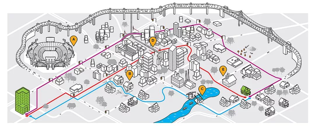 这张图展示了,当A点有一场体育活动造成了绕城高架快速路的堵塞,我们假设有一位司机现在下班回家出现了困难,所以她寻求地图导航应用的帮助。据导航应用显示,最短也是最快的路线是图中蓝色的路径,它蜿蜒穿过一片居民社区,随后是几处急转弯道、一座吊桥(C)——如果不清楚吊桥的通行时间表肯定会耽误回家的行程。另一条红色的路线从市中心(D)穿过,并且会经过一所小学的正门,导航应用不知道学校刚刚放学。幸运的是,我们的司机熟悉这片区域,所以她选择了紫色的路线,即使导航显示这并不是最快的选择。如果不熟悉这片区域的司机肯定会陷入一片混乱,甚至会遇到危险。